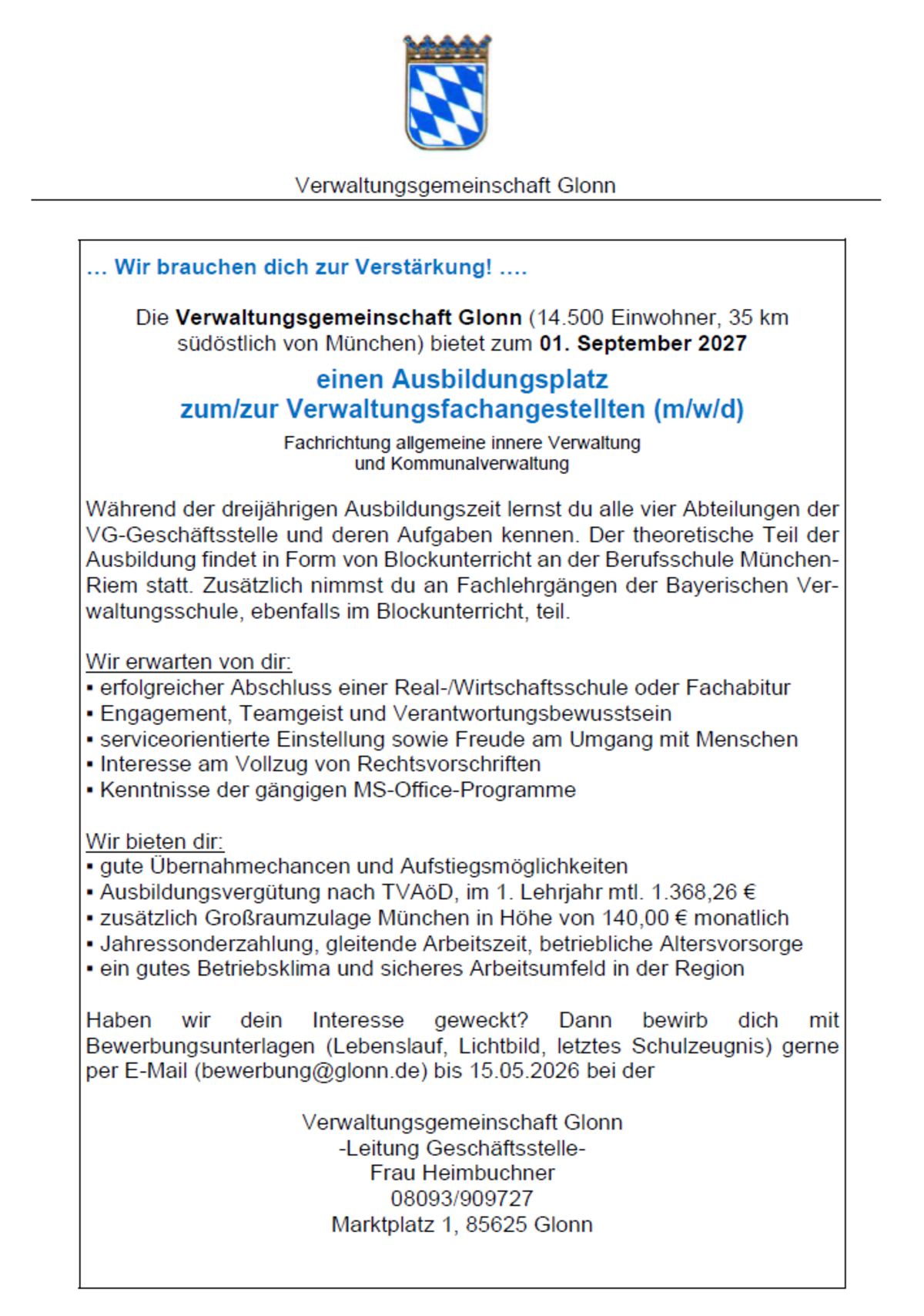 Ausbildungsplatz bei der VG Glonn